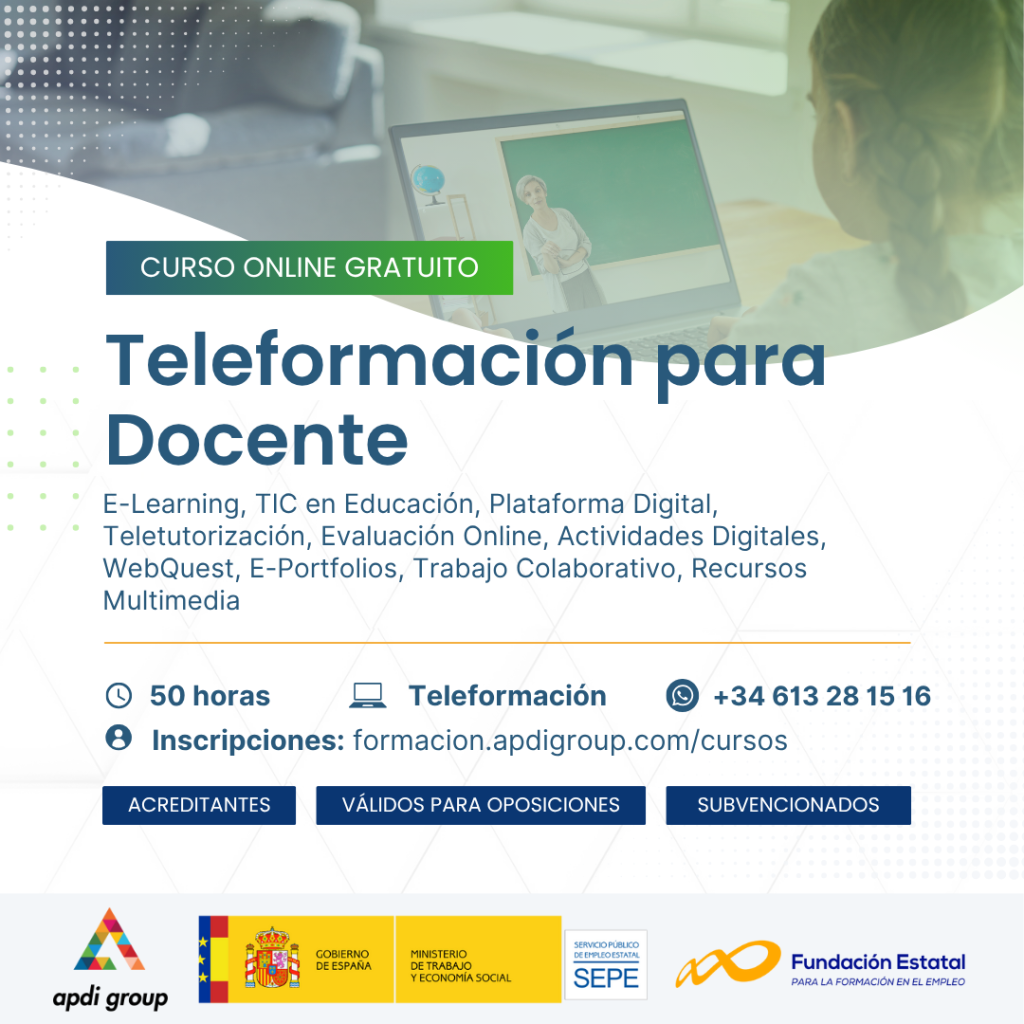 Este curso está diseñado para conocer fundamentos básicos sobre la teleformación para docente. A lo largo de este programa de aprendizaje vas a profundizar en aspectos relacionados con las ventajas del e-learning y los elementos necesarios para llevarlo a cabo, así como la importancia de la tutorización (evaluación, diseño de actividades, buscar, seleccionar e implementar materiales y recursos multimedia) y el uso de los espacios virtuales para el trabajo colaborativo.